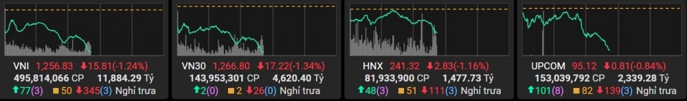 Chứng khoán phiên sáng 30/5 đóng cửa với chỉ số VN-Index giảm mạnh 15,81 điểm (1,24%) xuống mức 1.256,83 điểm với 495,8 triệu cổ phiếu khớp lệnh, tương ứng giá trị giao dịch đạt hơn 11.884 tỷ đồng trên sàn HOSE. Độ rộng thị trường nghiêng về số mã giảm với tỷ lệ mã tăng giá/mã giảm giá là 77/345.